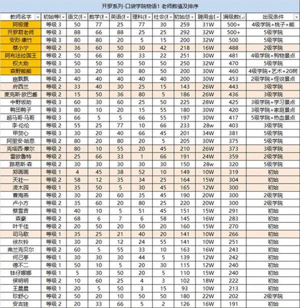 4、【初期老师选择】浅橙色底色是初期好用的老师,每个班都要单配一个老师,否则下降声望。10W-16W的初期用非常好,除了小蔡你们有钱可以升级,其余不要升级!点数很珍贵,后期直接换了。