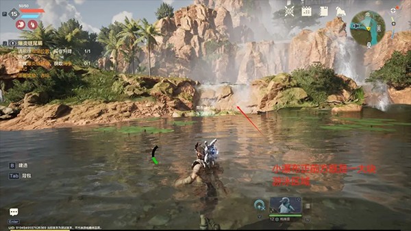 来到钓鱼点进入水中逆水流往上走就有一个瀑布,瀑布整块区域都是深水区,可供拓荒者们尽情遨游