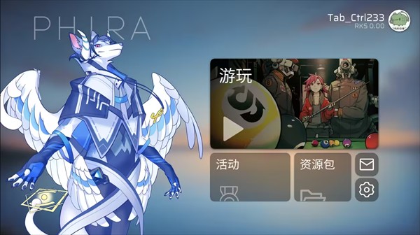 一、进入游戏主界面,你可以看到“游玩”,“资源包”,“信息”(邮件图标),账号和“设置”(齿轮图标)