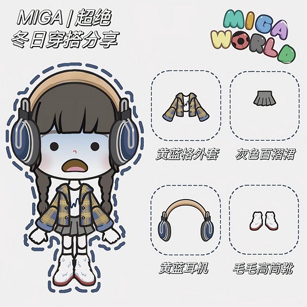 5、黄蓝格外套+灰色百褶裙+黄蓝耳机+毛毛高筒靴。