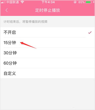 5、选择好定时停止播放的时间,例如这里定义为15分钟后停止播放;