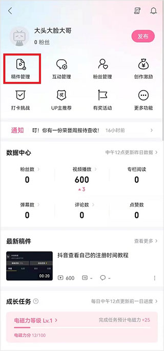 3、在该功能中,点击上方的【稿件管理】进入到自己发布的作品页面;