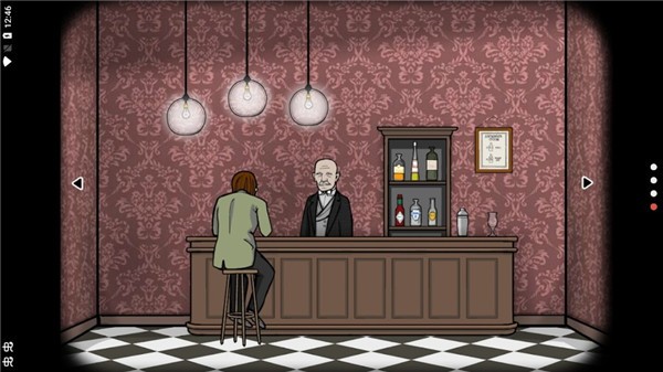 1、进入游戏,在吧台上有一个穿着绿色衣服的男人和一个穿着黑色西装的男人,绿色西装的男人说,别管我,我就想喝喝酒,黑色西装的男人说,给那个男人一杯酒,来到吧台右边,按照墙上的画框里提示倒两杯伏特加和两杯橙汁,得到一杯螺丝起子鸡尾酒。