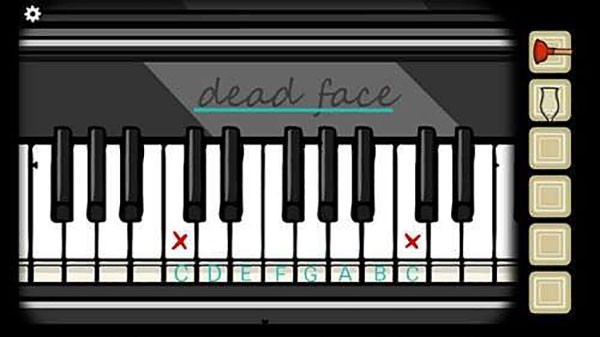 6、画面向左转,点击钢琴,上面写着dead?face,按照我们刚刚记下来的顺序,正确弹奏钢琴的琴键,会有一只手伸出来,我们跟着手的提示弹奏右侧红色叉范围的钢琴键,正确弹奏之后,这只手就会送出来一个钥匙。
