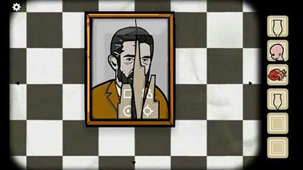 15、点击男人脑袋上被枪打出来的洞,进入后先向左走,得到第一个白色方块,看到女人之后往里走,得到第二个白色方框,再往里走,得到第三个白色方块,出去再进入一次走右边的路,点击两次得到第四个白色方块。