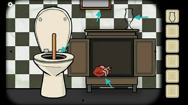 8、再点击洗手间下方柜子的部分,用皮搋子得到一个婴儿,打开柜子拿到一颗心脏,拿到柜子上放的红酒杯,离开洗手间。