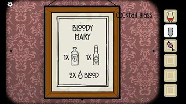 14、来到洗手间的画面,点击中间的画框,得到另一个提示,一杯伏特加,一杯Tabasco辣酱,两滴血,我们得到一杯血腥玛丽,给男人喝下后,男人开枪自杀。