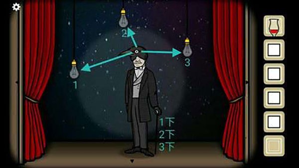 17、第四幕,先是根据乌鸦先生手势判断点亮哪个灯泡,然后是根据乌鸦先生拐杖想的次数判断是点亮那个灯泡,最后是根据乌鸦先生眼睛看向的方向判断是点亮哪个灯泡,第四幕结束。