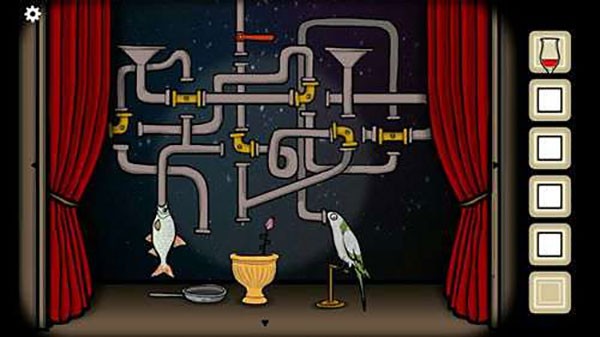 16、第三幕,回到舞台把花种到黄色的花盆里,正确调节管道的摆放如图,让水落入花盆里,花盛开拿到鸟食,依旧正确摆放管道的位置,把鸟食给鸟,吃到后得到鸟蛋,依然正确摆放管道的位置,让鸡蛋落入平底锅中,得到虫子,在正确连接管道,把虫子喂入鱼的嘴中,第三幕结束。