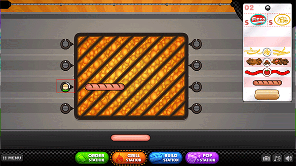 3、先将热狗放到烤炉上,注意左侧指针的颜色,当指针变成橙色时再次点击热狗进行翻面。(注意不要让它烧焦了)