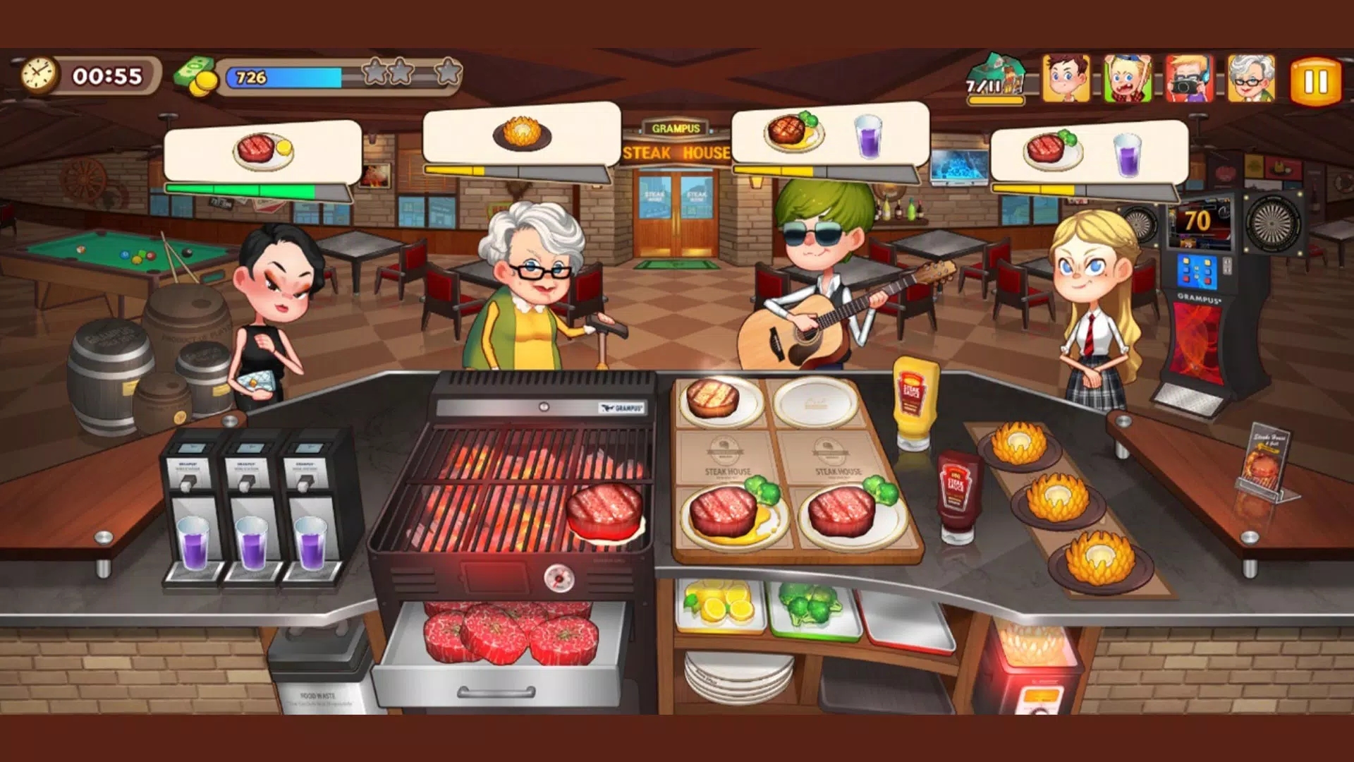 4、在游戏中玩家们在制作牛排的时候一定要注意牛排的制作过程,(可以从红条框里看顾客要的熟度)并且还要注意每个客人要的牛排都是不一样的,熟的程度不同玩家们就要注意正确的去将那些食物制作出来,否则客人是不会要的。