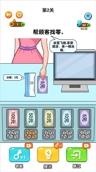 2、同样的方法,只不过这些的商品从口香糖的5块钱变为了冰棍3块钱,将左边的1元钢镚提交两个给顾客。