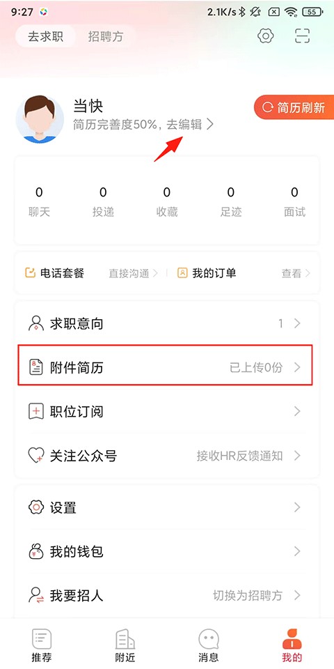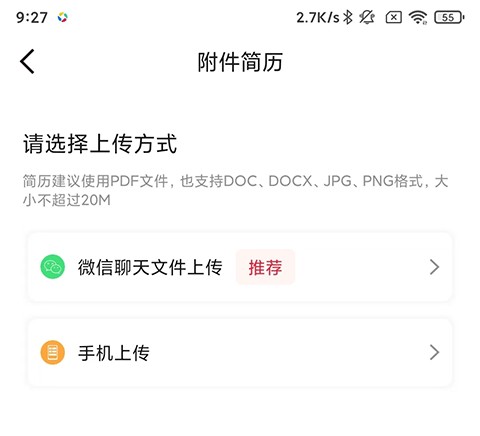 3、也可以选择上传简历附件,使用微信聊天文件上传或手机本地文件上传;