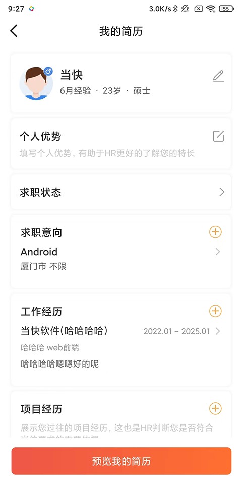 2、在此页面完善你的在线个人简历,还可以点击下方预览简历;