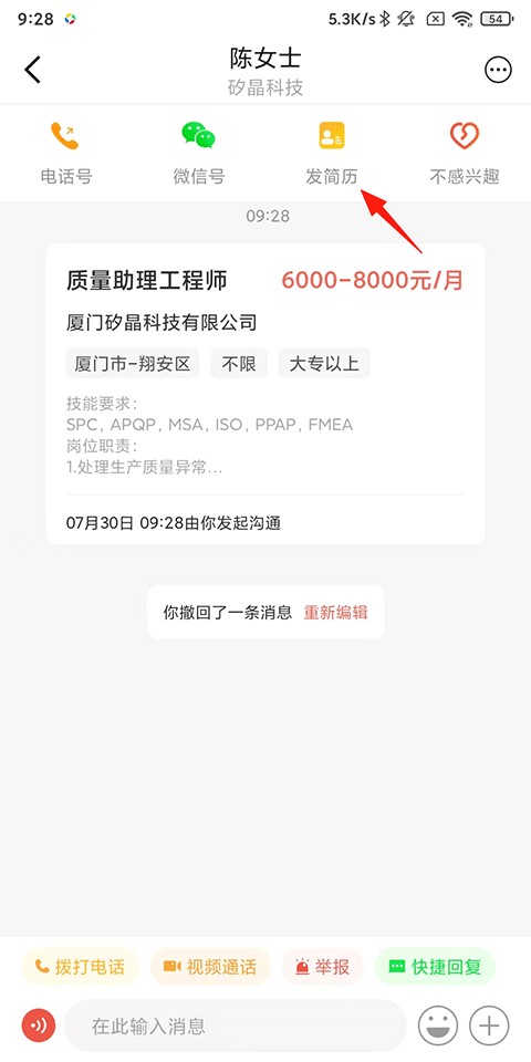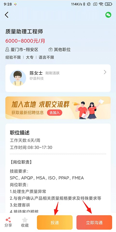 6、与HR沟通交流该职位的具体细则和你的个人情况,也可以直接点击上方的发简历让HR对你有个初步的了解再进行沟通。
