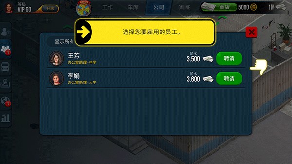 4、根据引导进入“公司”界面,招募你的第一名员工。