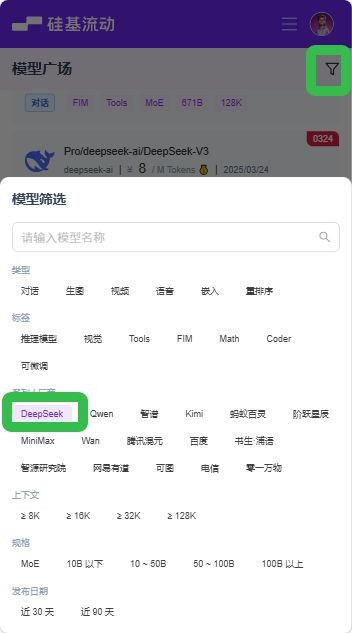 5、返回主页面,点击右上角的筛选器,选择“DeepSeek”选项。