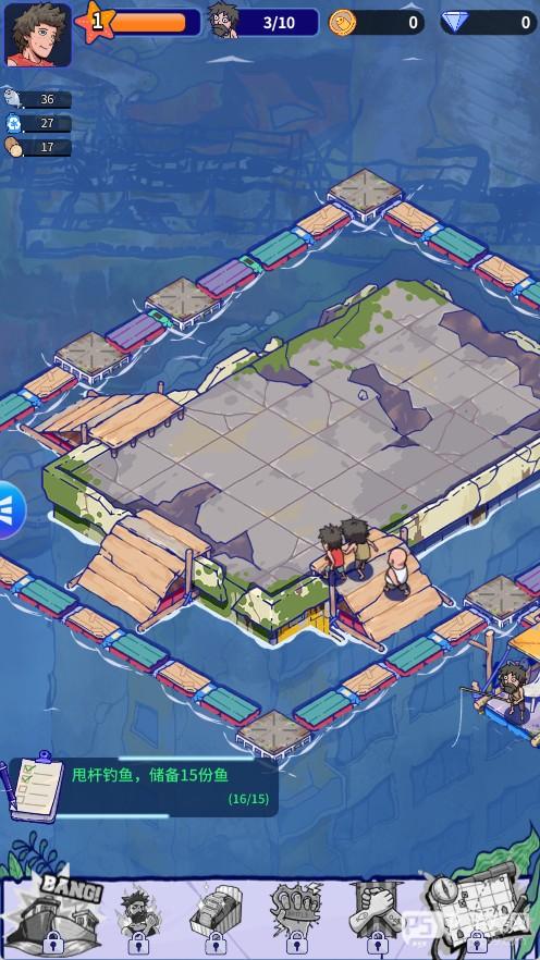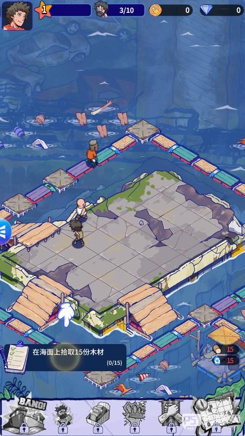 1、初始阶段资源少,第一目标就是收集漂浮资源,木板、绳索、金属、塑料。