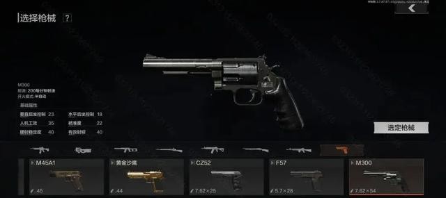 首先新增的是一把转轮手枪M300,它使用7.62×54毫米大口径弹药。枪械后坐力较大,同时可以使用长枪管并且兼容各类高倍镜。但是弹巢和枪管间较大的缝隙导致的气密性问题,使得枪机能量转化效率和射击精度有限。