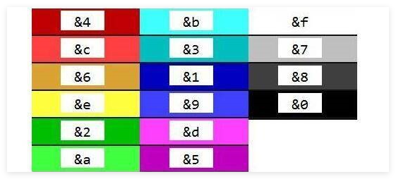 §4=大红、§c=浅红、§6=土黄、§e=金黄、§2=绿、§a=浅绿、§b=蓝绿、§3=天蓝。§1=深蓝、§9=蓝紫、§d=粉红、§5=品红、§f=白、§7=灰、§8=深灰、§0=黑,这样一来大家要是想打出什么的话就可以按照上面的操作下就可以了。