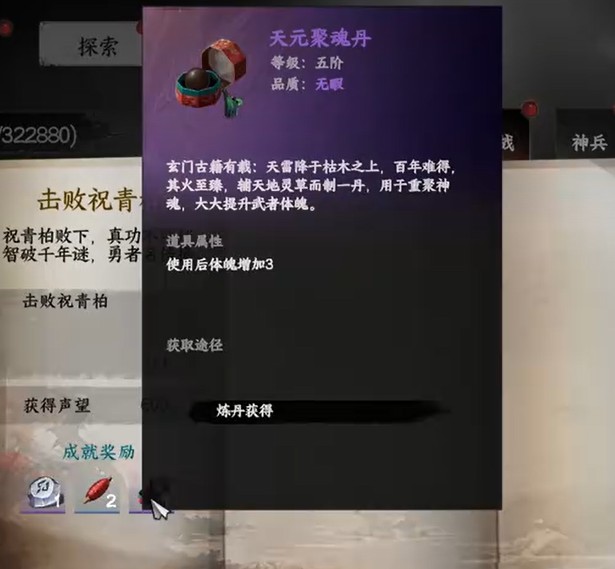 不过,尽管如此,天元聚魂丹的获取途径并不是完全没有保障。在游戏的成就系统中,存在一个需要大家挑战的任务。在完成挑战后,玩家可以从祝青柏身上获得天元聚魂丹。这一途径目前是相对稳定的获取方式,只要完成相应挑战并击败祝青柏,玩家便能够获得一颗天元聚魂丹。这种方式相比其他途径,操作简单且结果明确,是当前版本下较为理想的解决方案。