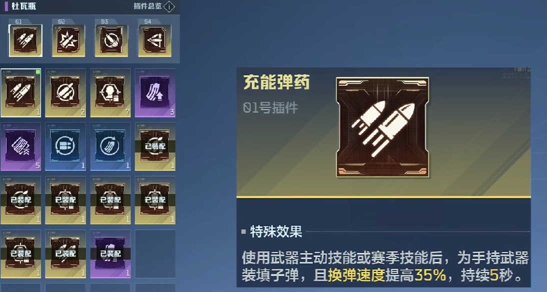 杜瓦瓶的插件选用方面,一号位置建议使用充能弹药,充能弹药的特殊效果是,可以为手持武器自动填充子弹,同时换弹速度可以提升35%,持续时间为五秒。