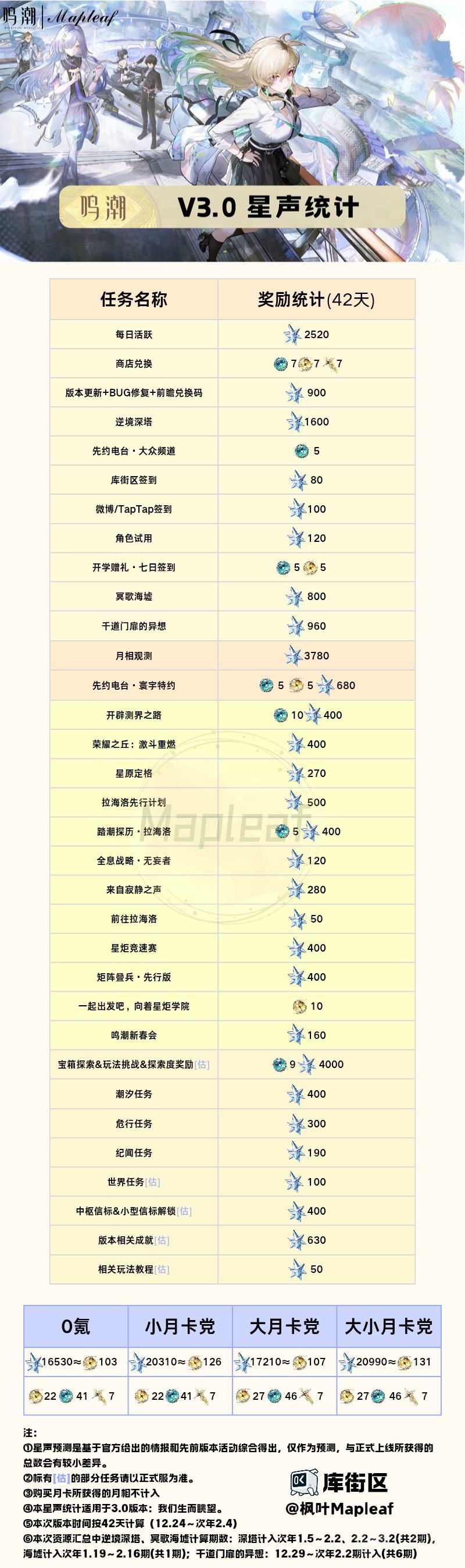 1、部分活动参考了先前版本星声数量,可能存在部分差异。