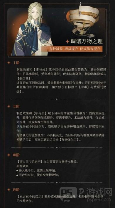 增益集合去掉了双防提升、痊愈1和反震1,新增了创伤加成、额外行动创伤加成、仪式威力和本源创伤提升。高阶2技能赋予的buff数量和持续回合提升。