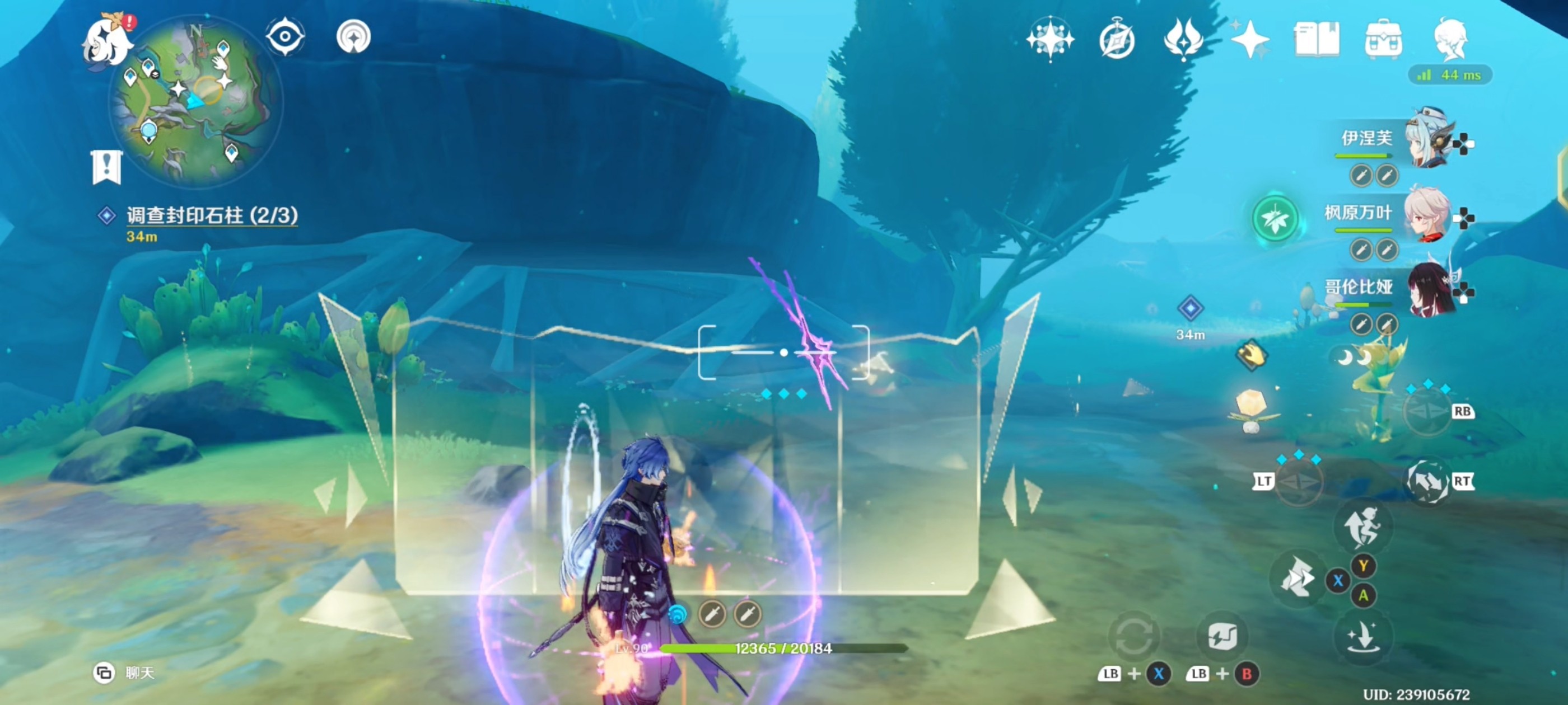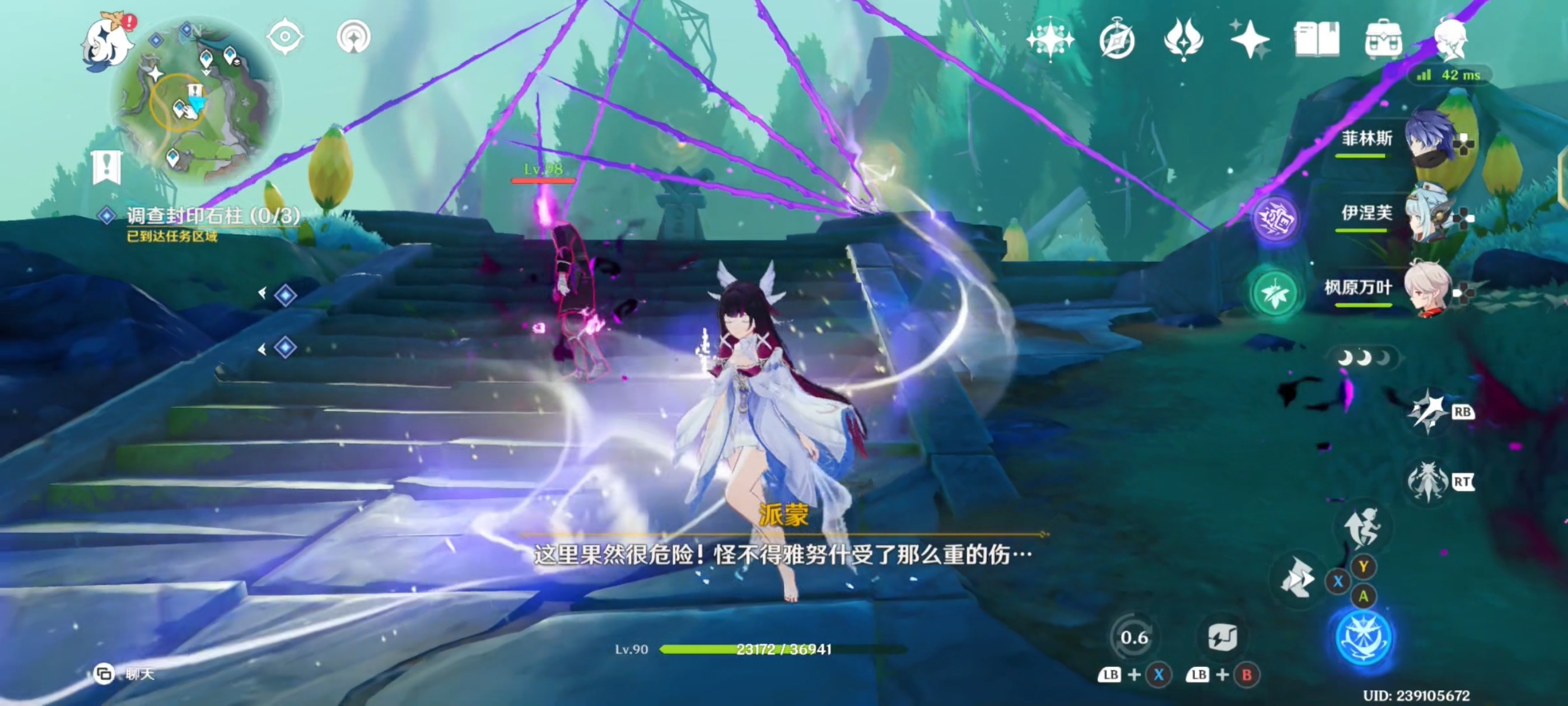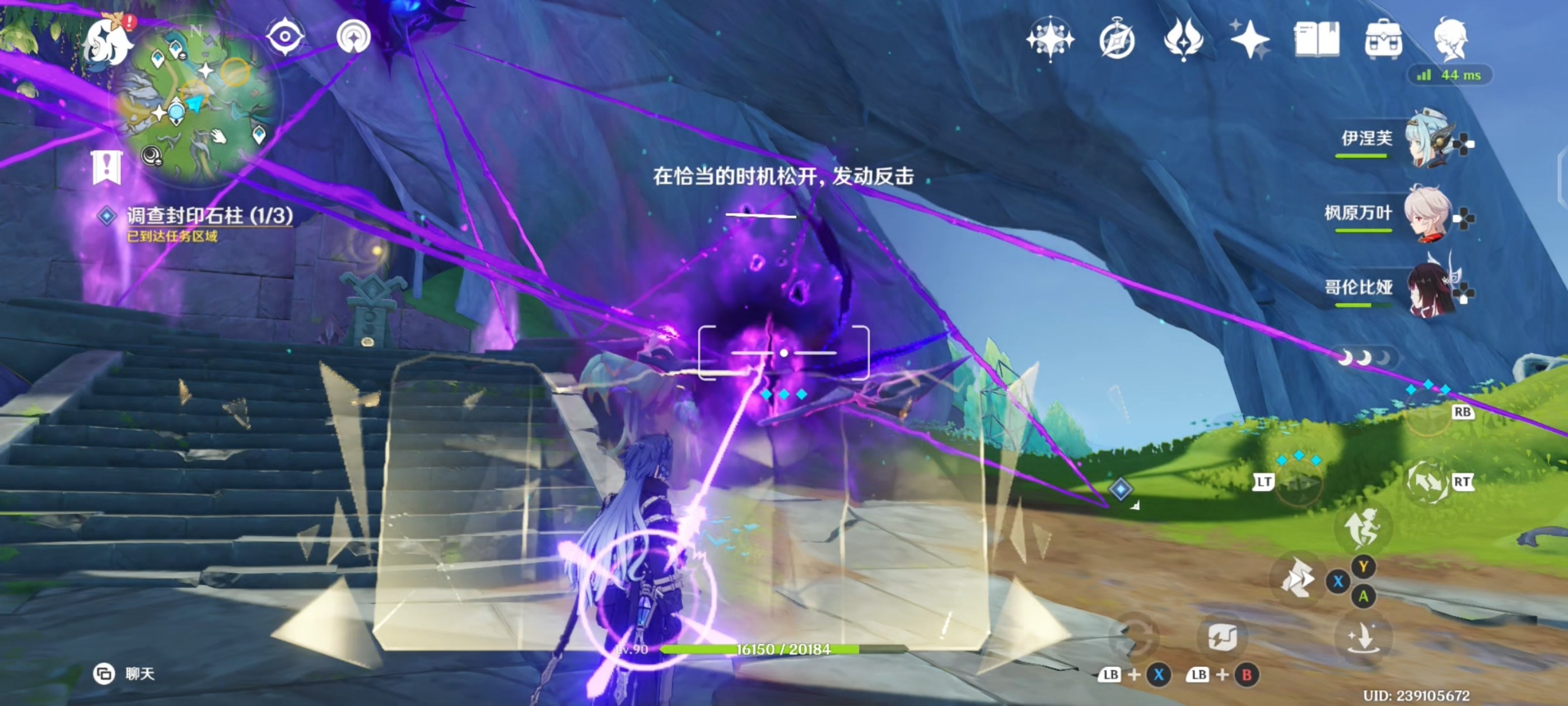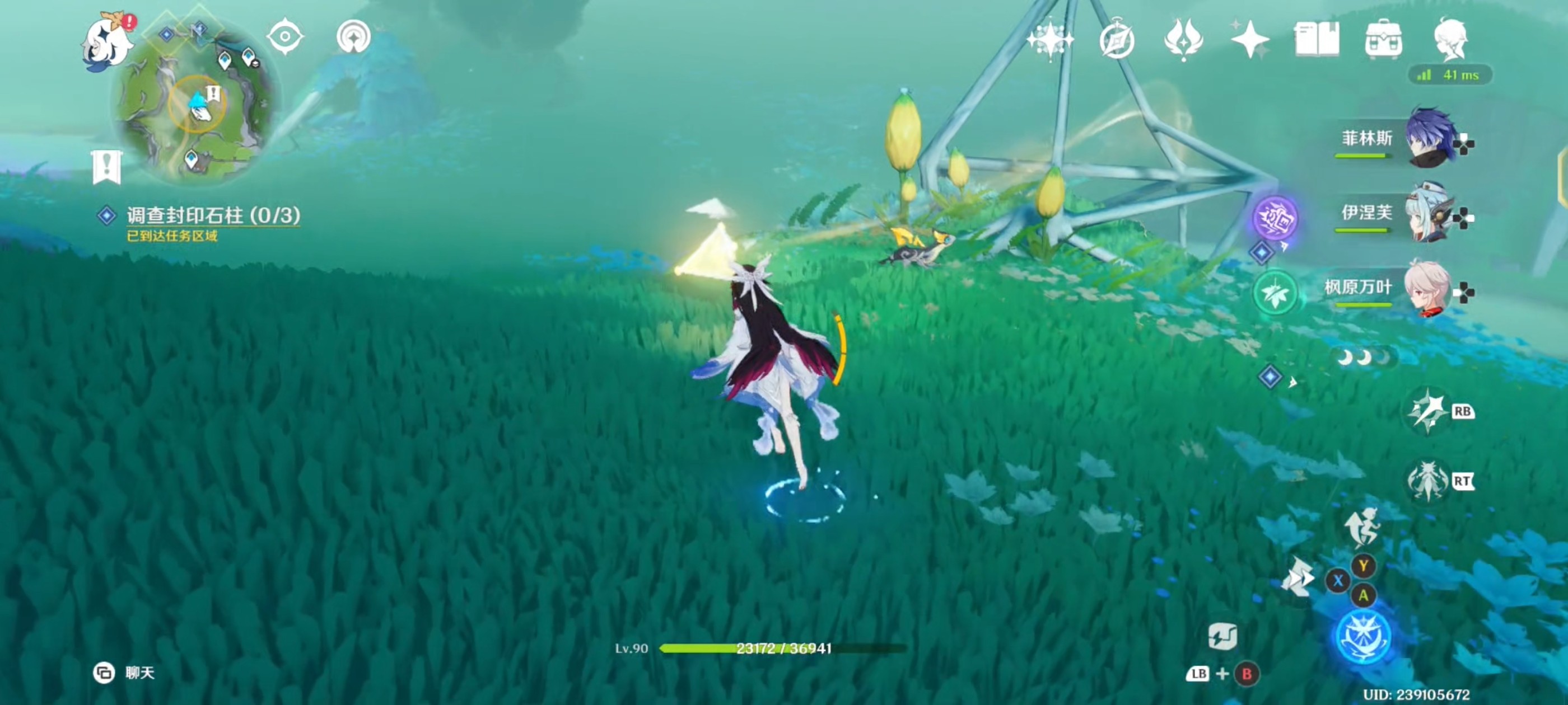 徒步前往下一个任务区域,途中遇到[深渊隙线]时,利用附近的[锋萼花]将其清除后再于棱镜触碰并跟随移动至石柱附近;