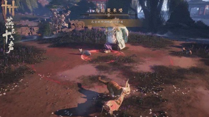 御猫有两个比较特别的招式需要注意。第一个,它会把一条锦鲤扔到场地中间,然后一堆猫会围过来,抱着锦鲤开始蓄力。这时候需要一个人变成猫去把鱼抢走,其他人负责把猫拦开、打散。鱼被抢走之后,会触发旋风效果,可以削弱猫群的攻势,打开输出窗口。