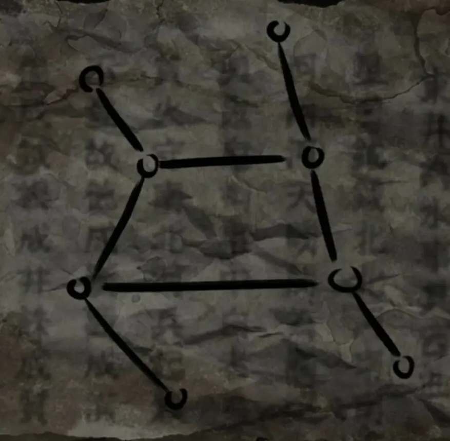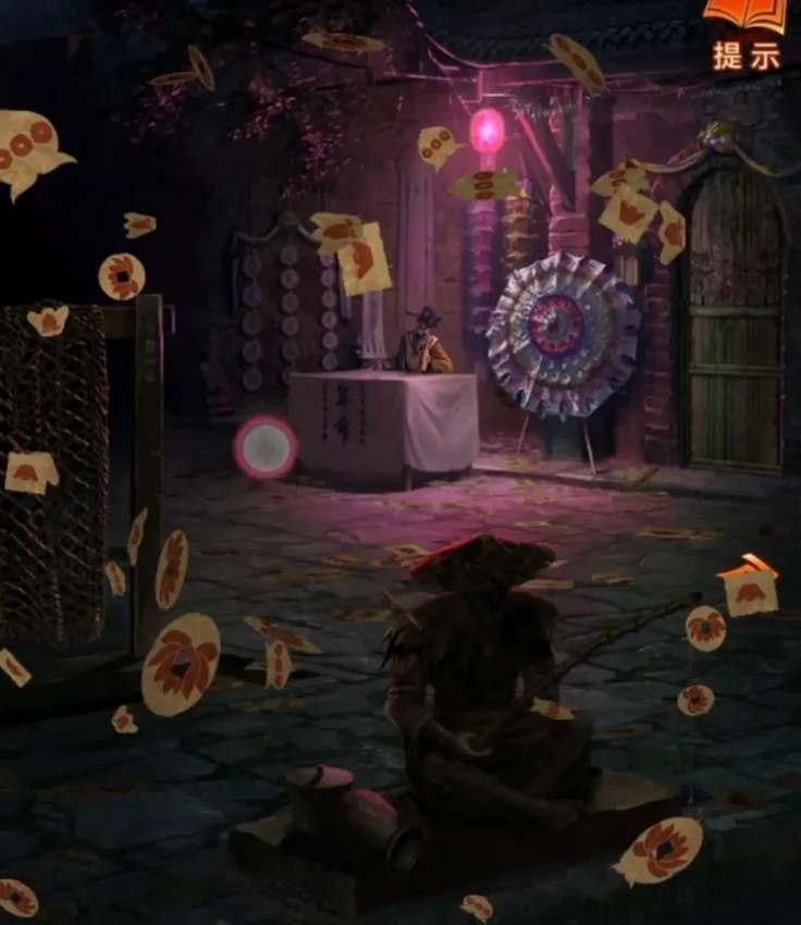 13、此时翻看无字书提示是要烧香。先查看算命右边的门,将龟壳给装上去后调掉出三根香和一张纸条,纸条上是奇怪的图案,看起来是需要对照其他线索的,所以先后退来到右边的桥边,上桥对中间的纸使用花钱,会发现有8枚,和纸条上的圆圈数量相同。