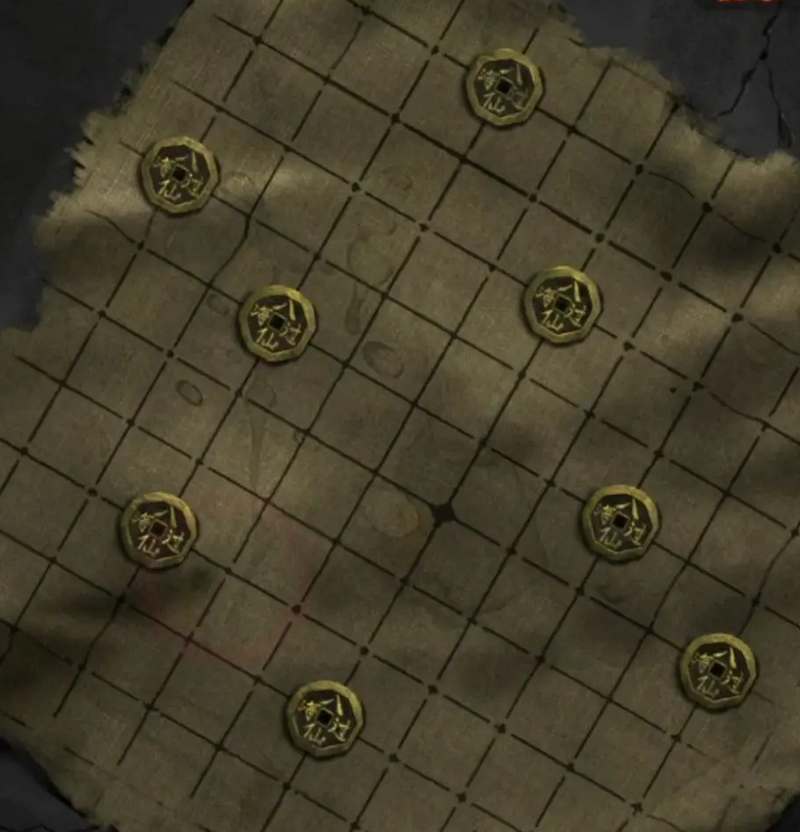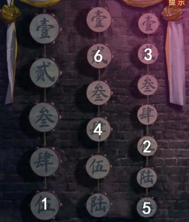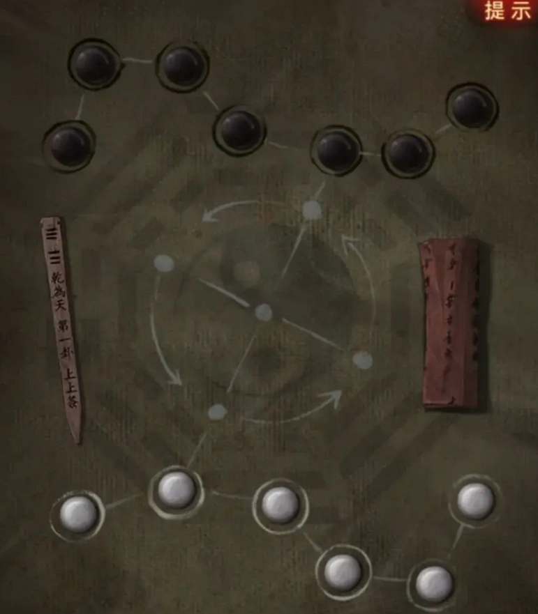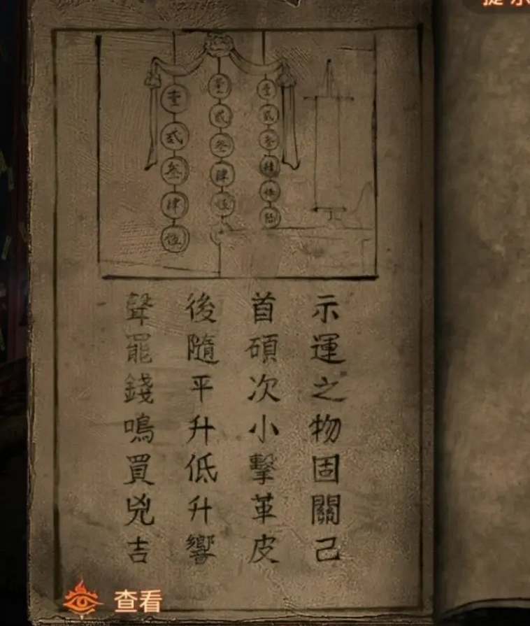 10、剧情后地上出现了用铜钱的棋盘,左右的灯都能调整颜色,可惜都没有线索,打开书看提示吧。11、图案很明显是算命左边的那个鼓,第二句和第三句是提示,首硕次小,硕是大的意思,也就是先大再小,然后平升低升响,也就是【平-上-下-上】,我们现在手里的数字密码就是红光下的那个552472,先回到算命场景,对照左边的鼓查看数字。
