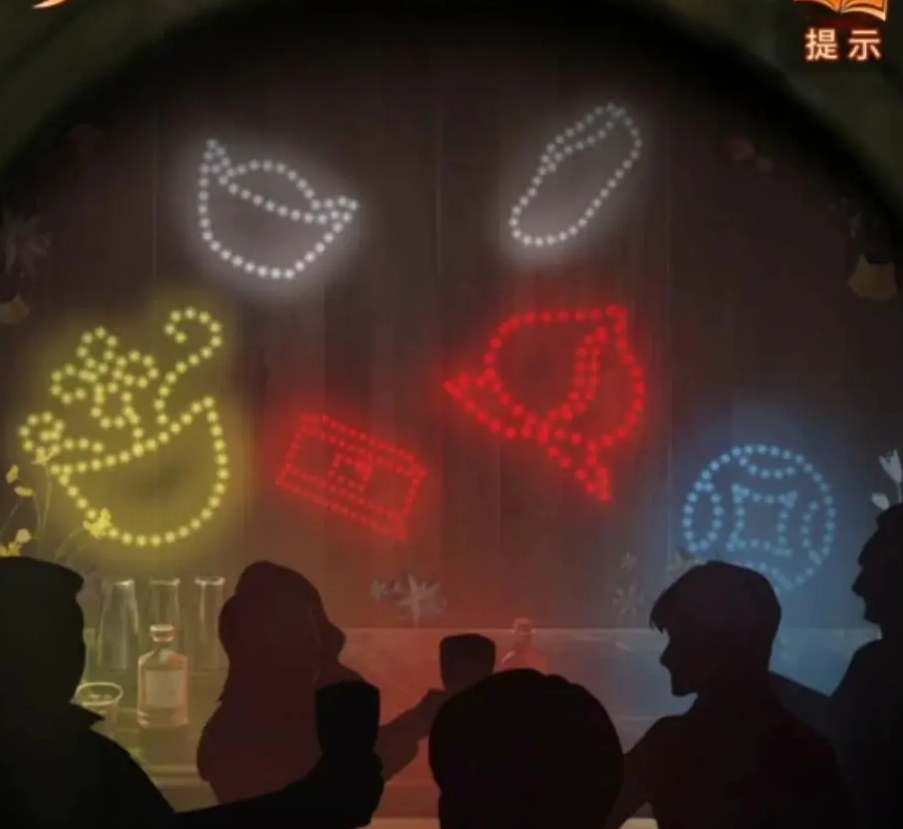15、后退进算命右边的门,既然下下签都和男主有关那么遗照肯定也是有关了,对中间的箱子使用遗照后灯变了颜色,再次查看望远镜,发现灯光的颜色和形状都很眼熟,记下来红色桃子+箱子,白色元宝+鞋,黄色咖啡?蓝色铜钱。