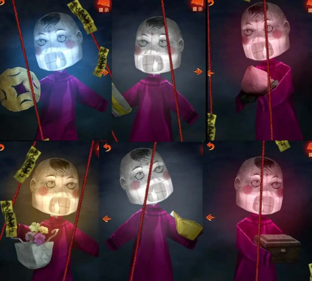 2、观察天上的纸钱:圆形纸钱莲花,桃形纸钱上三个圈,方形纸钱上元宝,元宝形纸钱上桃子。记下来后查看左边的铜渔网,调整柱子图案拿到铜渔网。
