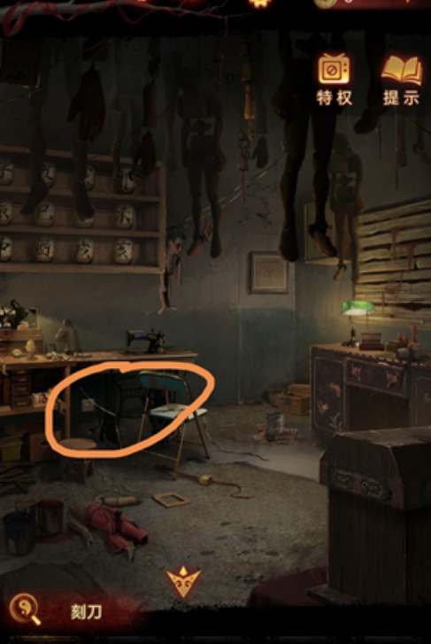 15、点击椅子,用刻刀给人脸刻眼睛,人偶吐了,获得钥匙;