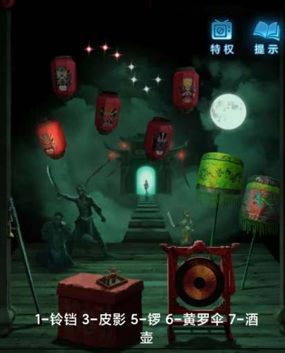 6、根据北斗七星的数量点击相应的物件:1=铃销3-皮影5-锣 6-黄罗伞7-酒壶;