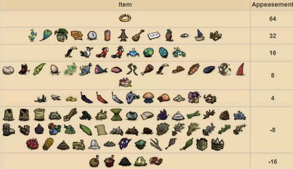 在火山季到来的时候,玩家可以将水母、螃蟹、鱼类等海洋生物或者怪物肉等材料献祭给火山提升安抚值,从而延后火山爆发的时间。如果提交了草、树枝等负安抚值的物品,反而会加速火山的爆发。