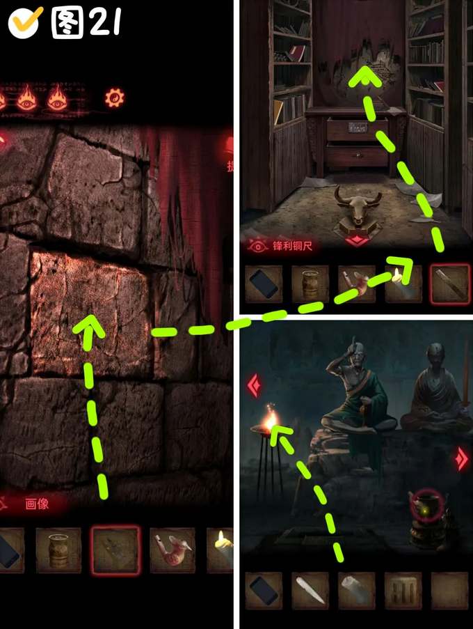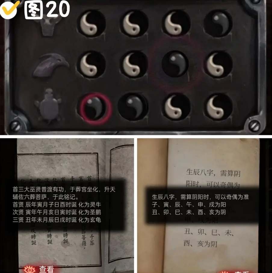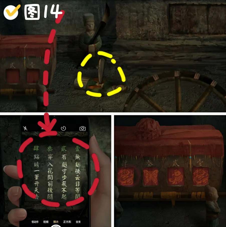 1、老头下方模型处躺着的陶人身上获得指针,对握着毛笔的陶人身后空白的墙使用手机,获得线索:1龙-2鱼-3蝴蝶-4龙,解锁前面的喜棺,获得石板1。