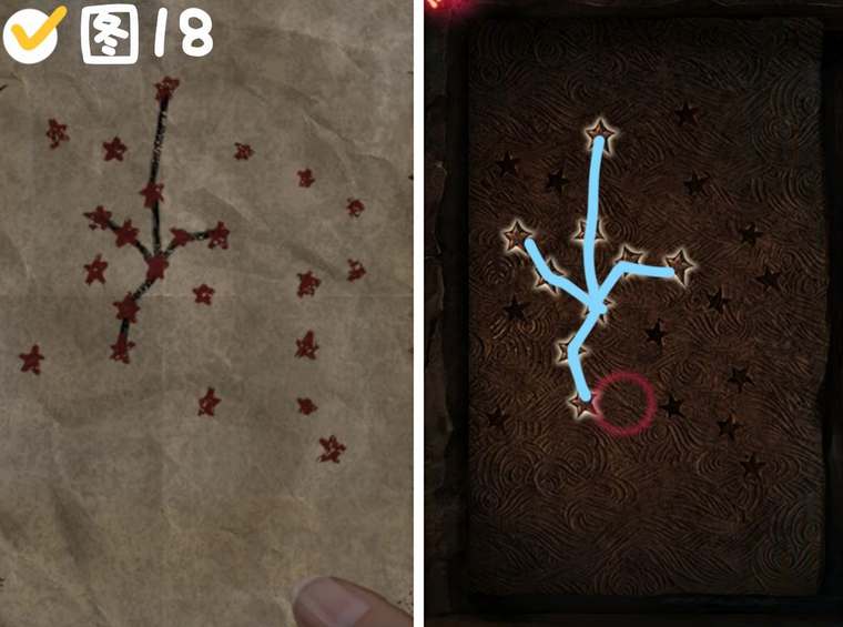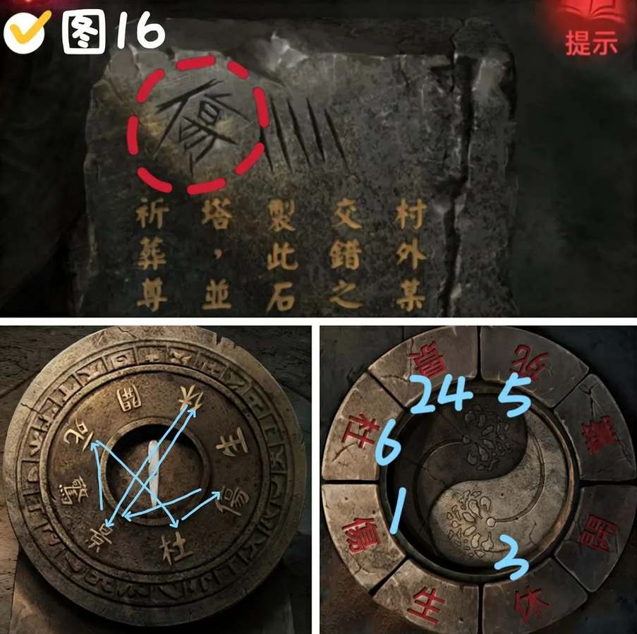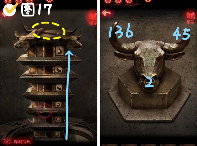 7、宝塔上方获得小锤子,观察宝塔的图形,顺序为“尖-圈-尖-钝-钝-尖”,按照顺序点击葬经阁内的牛的对应部位,获得星星线索图。