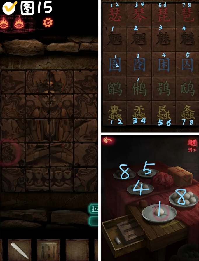 2、忌物阁右侧拼图完成后获得线索,颜色对应文字在线索中的数量:红王8个,蓝口5个,绿木1个,黄虫8个