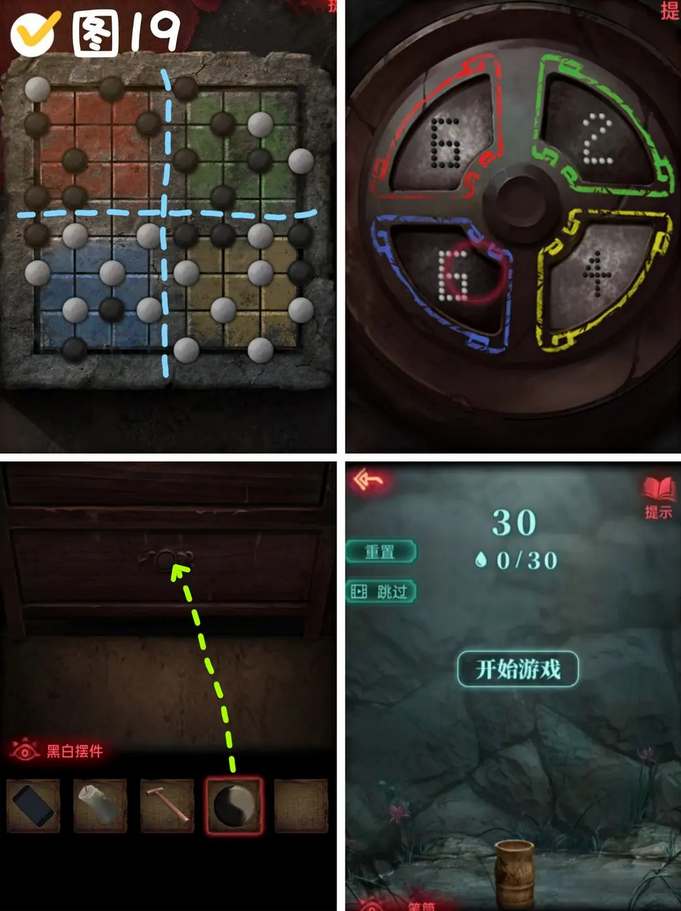 9、观察金童玉女处棋盘各颜色区域对应棋子的数量,红有黑子6个-黄有黑子4个-绿有白子2个-蓝有白子6个,解锁空洞中的棋罐,获得黑白摆件。