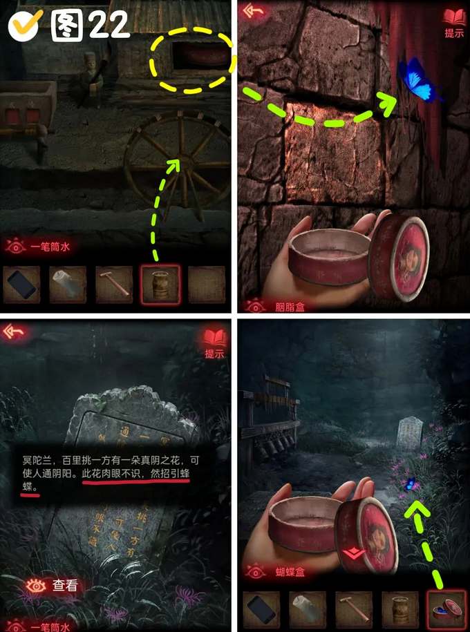 16、用胭脂盒在金童上方抓捕蝴蝶,获得蝴蝶盒。