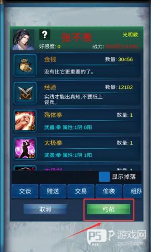 3、点击被红框和箭头标注的约战按钮发起战斗。