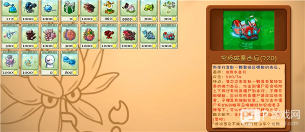 特点:每次攻击发射一颗具有聚拢效果的磁力西瓜,攻击到僵尸后会吸附上下两行有防具僵尸到本行,子弹无限弹射,且对有防具僵尸造成双倍伤害,子弹具有溅射效果。每次击中僵尸有5%的概率召唤随机加农炮类子弹落下。可以使用咖啡豆释放大招。铁器消失会增加场上所有磁暴西瓜攻击,且计算磁力系统增伤。