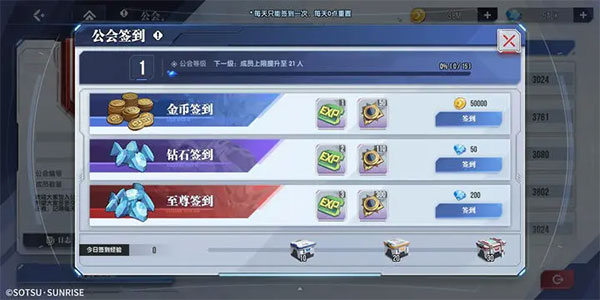 玩家每天有一次公会签到机会,分为G币、钻石、至尊三种签到方式,玩家获取公会币,而公会获取经验值,当公会累计获得不同经验值时,可以获得不同的档位奖励。各位指挥官们为了丰厚的奖励,每天一定要签到吖!!白嫖的福利不要白不要!