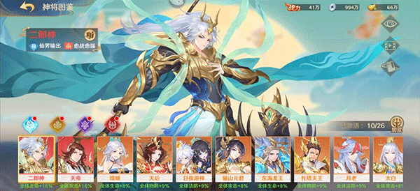 1号位天帝起手打控制,有概率使前排对手陷入【眩晕】;2号位二郎神释放群体伤害,并为后排的嫦娥附加伤害加层;3号位主角跟进伤害;4号位天后为至少3位队友治疗回血,并为自己和队友上【护盾】;5号位嫦娥对单列对手造成伤害,并为二郎神刷一层【护盾】;6号位月老为1、2号位队友增加伤害;为友军提供增益和防御。