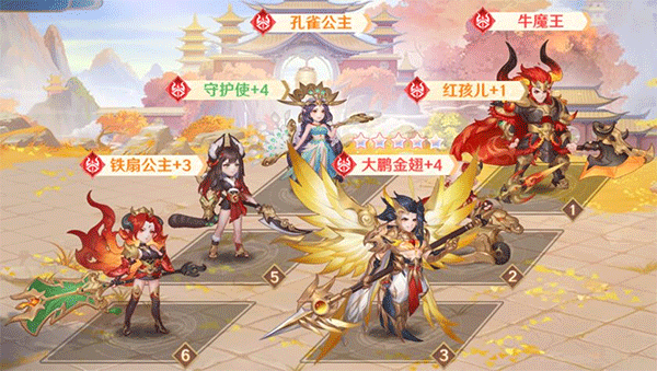 1号位红孩儿对敌方全体纵火;2号位金角压制对方,使其不能释放技能;3号位青牛高额格挡,抗住伤害;4号位孔雀公主为群体回血治疗;5号位主角跟进伤害;6号位银角收割战场。