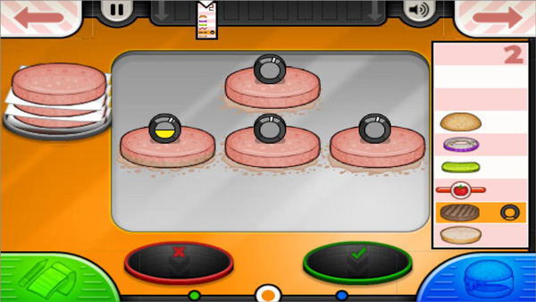2、时间用得少。在第一个客人来之前可以烤上几个肉饼。跟第一个客人交流一下,拿到菜单,再进烤炉,添加三个肉饼,准备用来烤嫩肉。