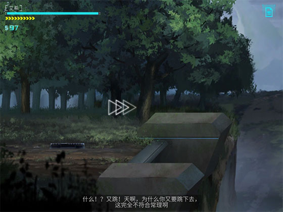 首先是在开始的迷路森林,走到一个悬崖边,会提示你攻击打开悬浮桥,可是如果连续掉下去三次,就会引起旁白的抓狂,然后直接传送进入新场景。