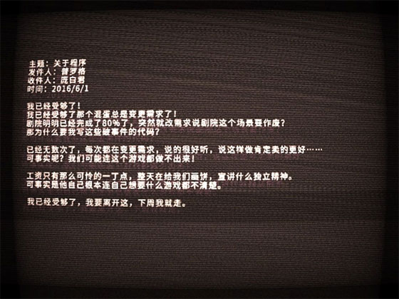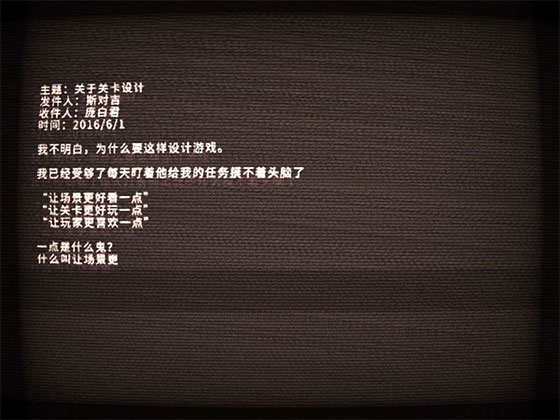 再之,进入剧院前,有一个阶梯,可以通过闪和跳跃进入一个场景里,里面有很多来自程序员,关卡设计师,原画师等工作人员的吐槽信件,而且在我们看新建的时候,旁白会很生气的说要全部记下来,给他们颜色看看之类的,就暂且当作是一个游戏设计者们的树洞吧…